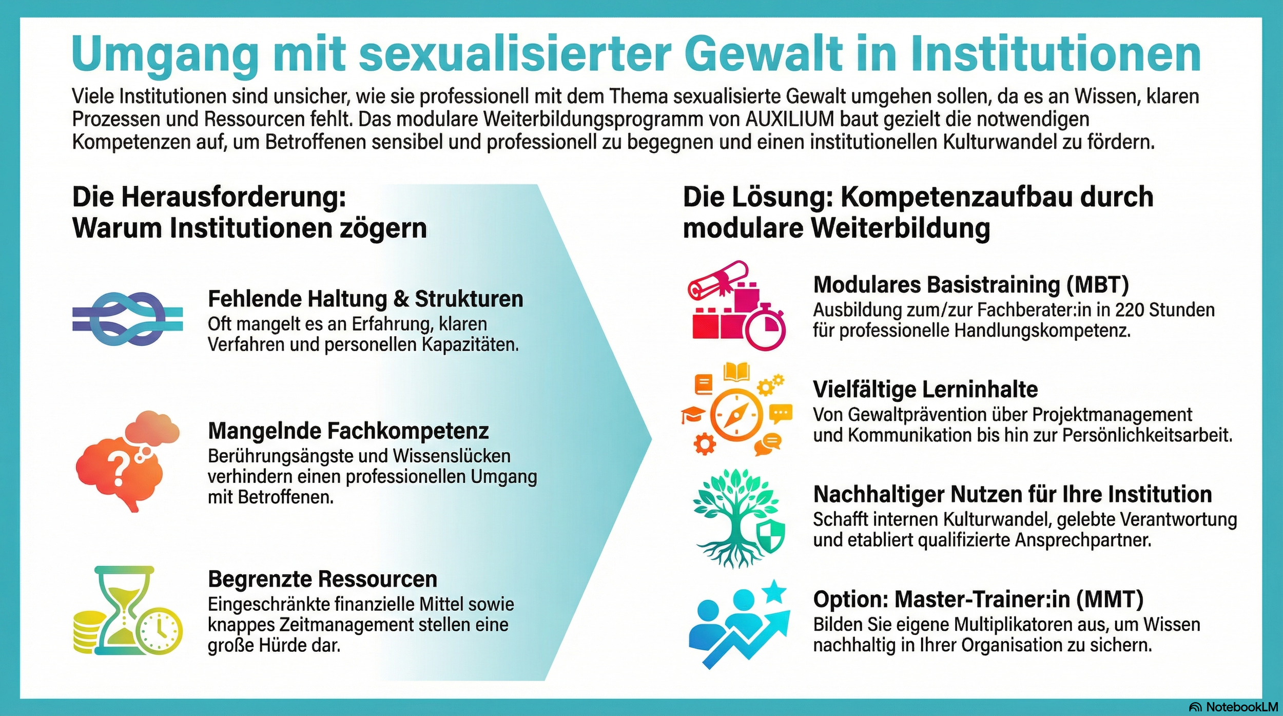 Nach erfolgreichem Abschluss (min. 90% Teilnahme plus Abschlussprüfung) erhalten die Teilnehmenden ein Zertifikat, das die erfolgreich absolvierten Module und die erworbenen Kompetenzen als Master-Trainer*in dokumentiert.Hinweis: Dieses Zertifikat ist intern und bescheinigt die Teilnahme und erworbene Kompetenz innerhalb der AUXILIUM-Weiterbildung. Es handelt sich nicht um eine staatliche oder externe Akkreditierung.